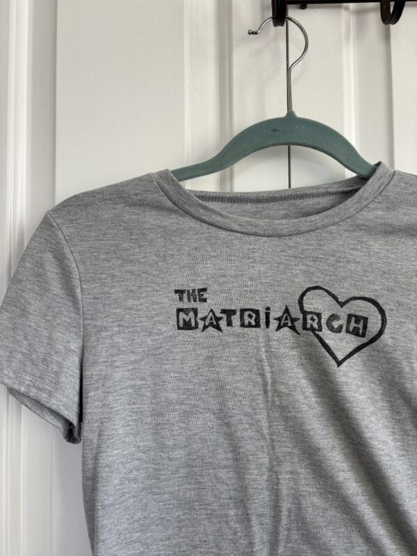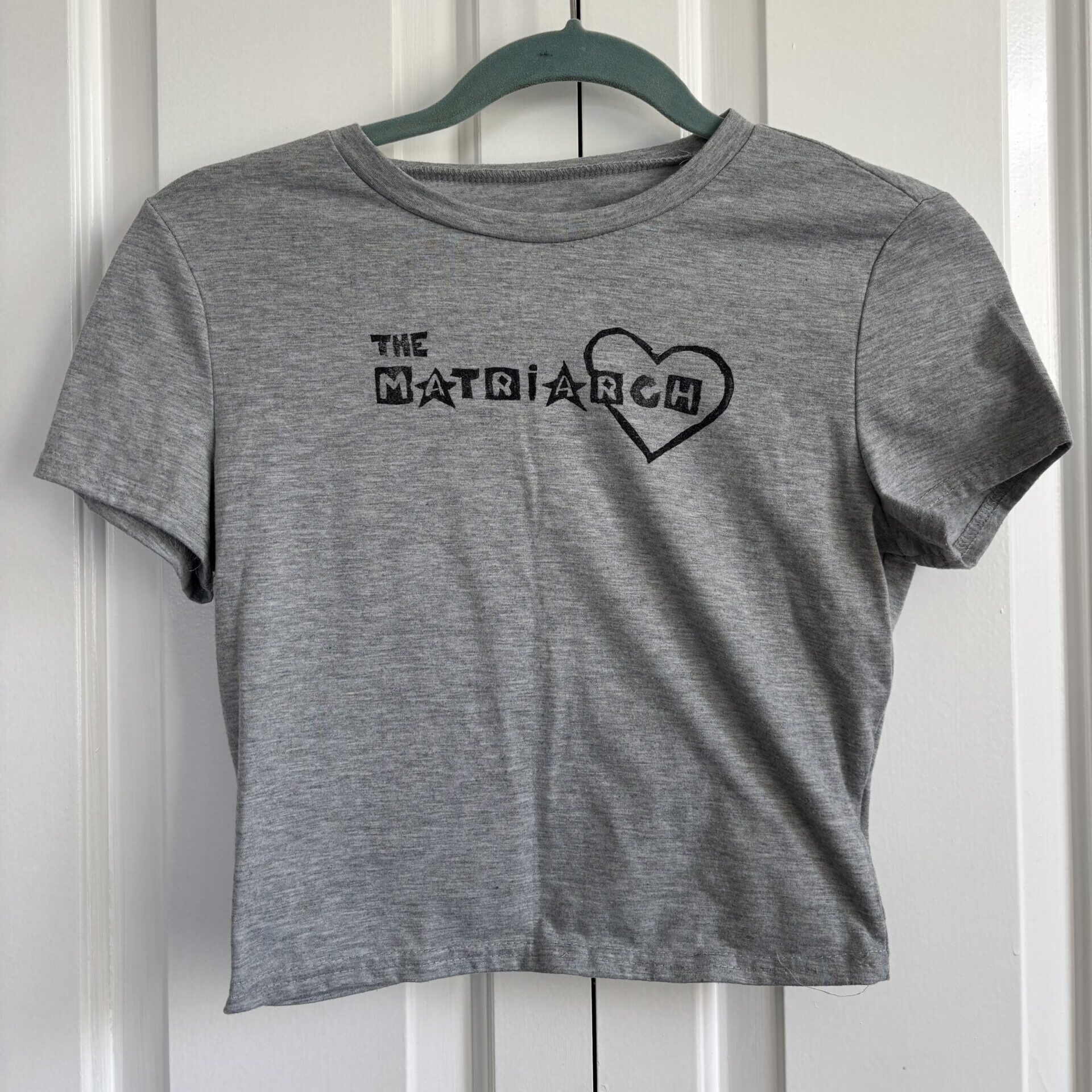 ‘The Matriarch’ gray crop top. Thrifted, no brand or size. I’d guess S. Printed by Mal Benoit.