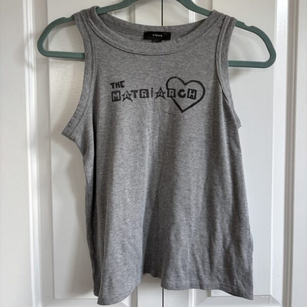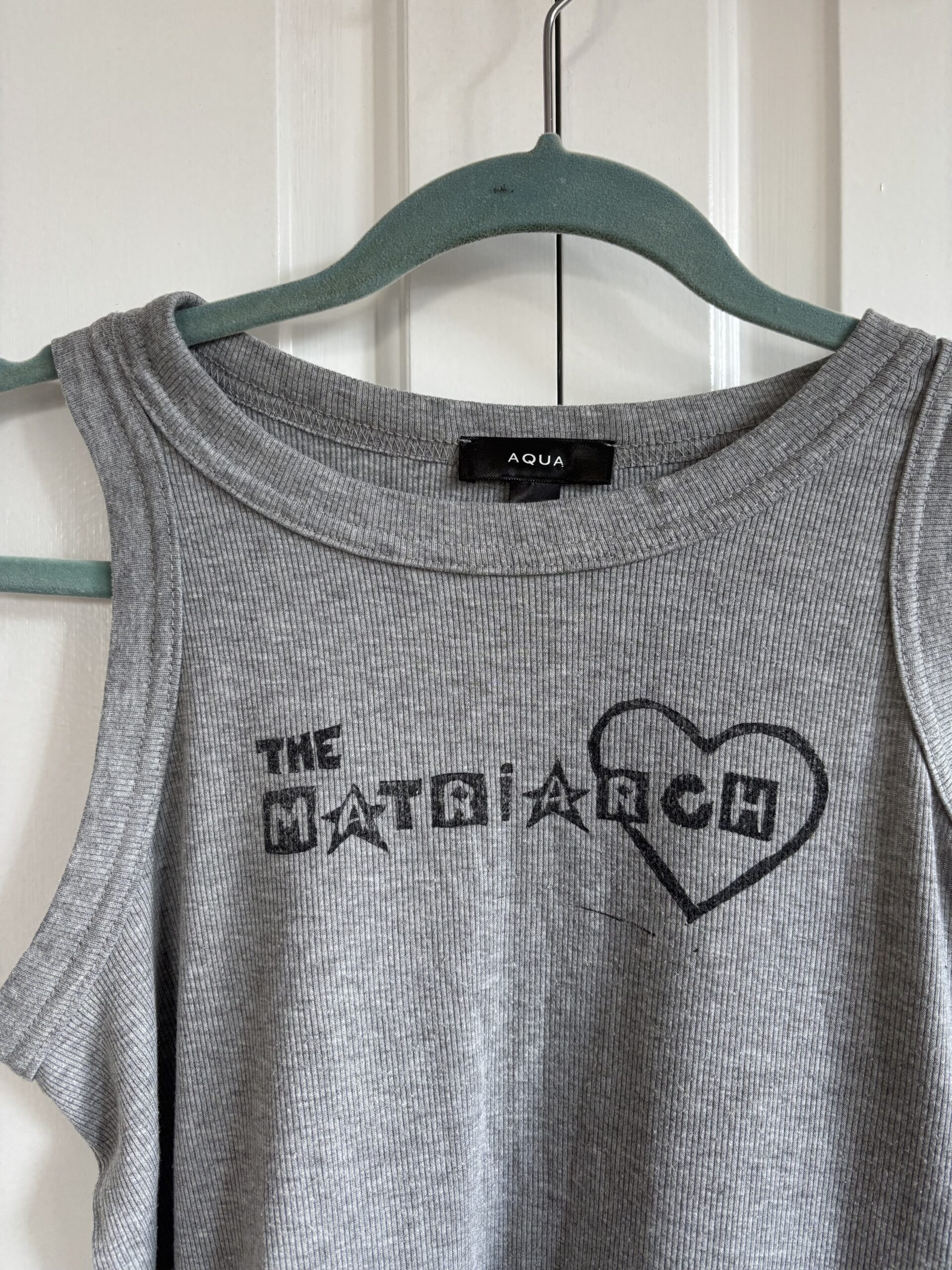 ‘The Matriarch’ gray tank. Thrifted, brand “Aqua”, no size but would guess M/L. Printed by Mal Benoit.