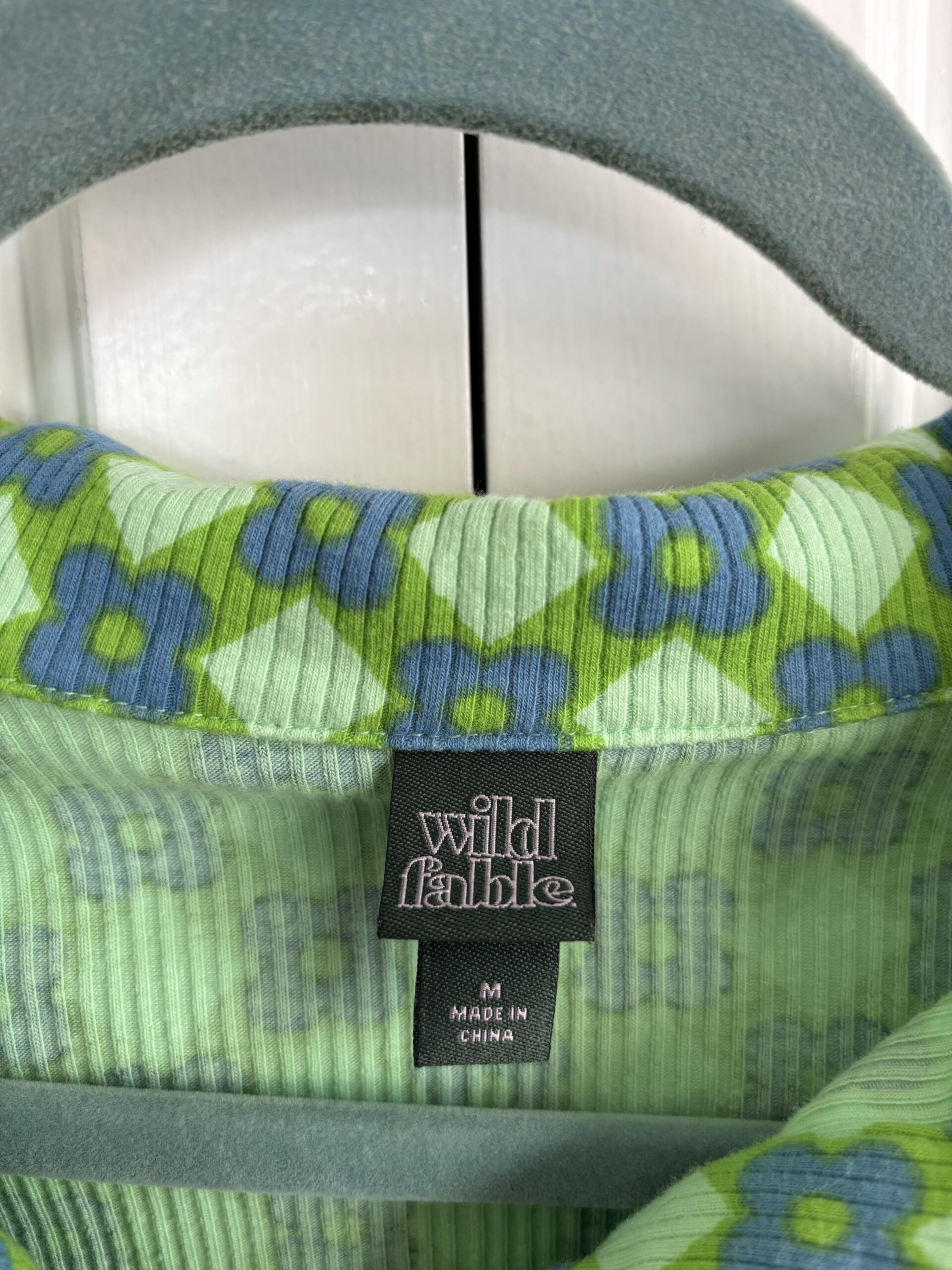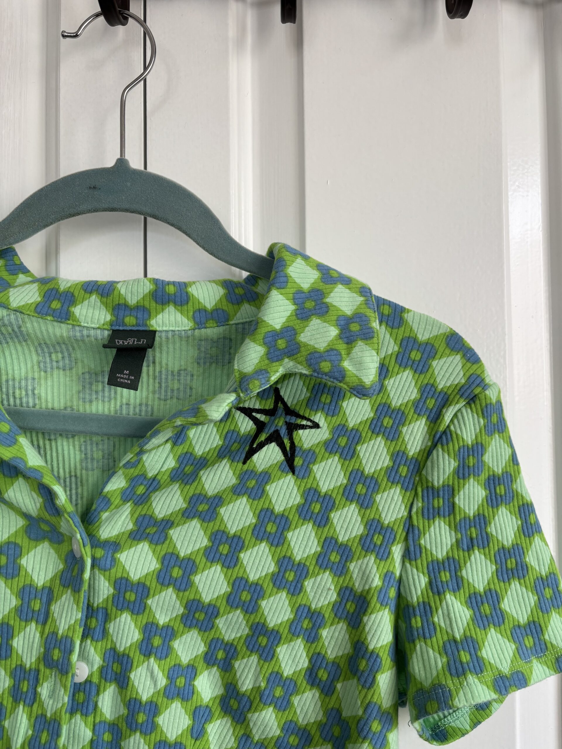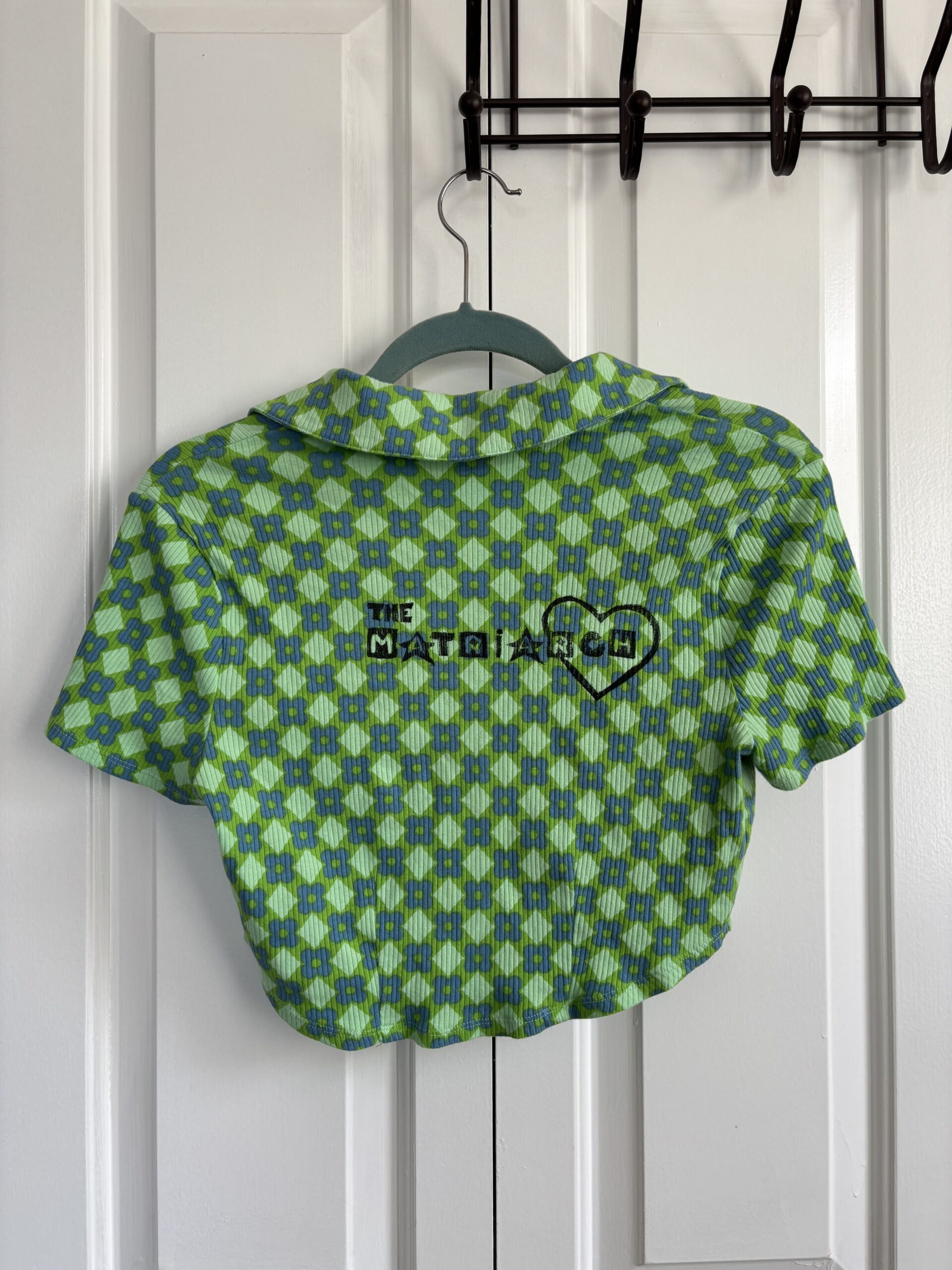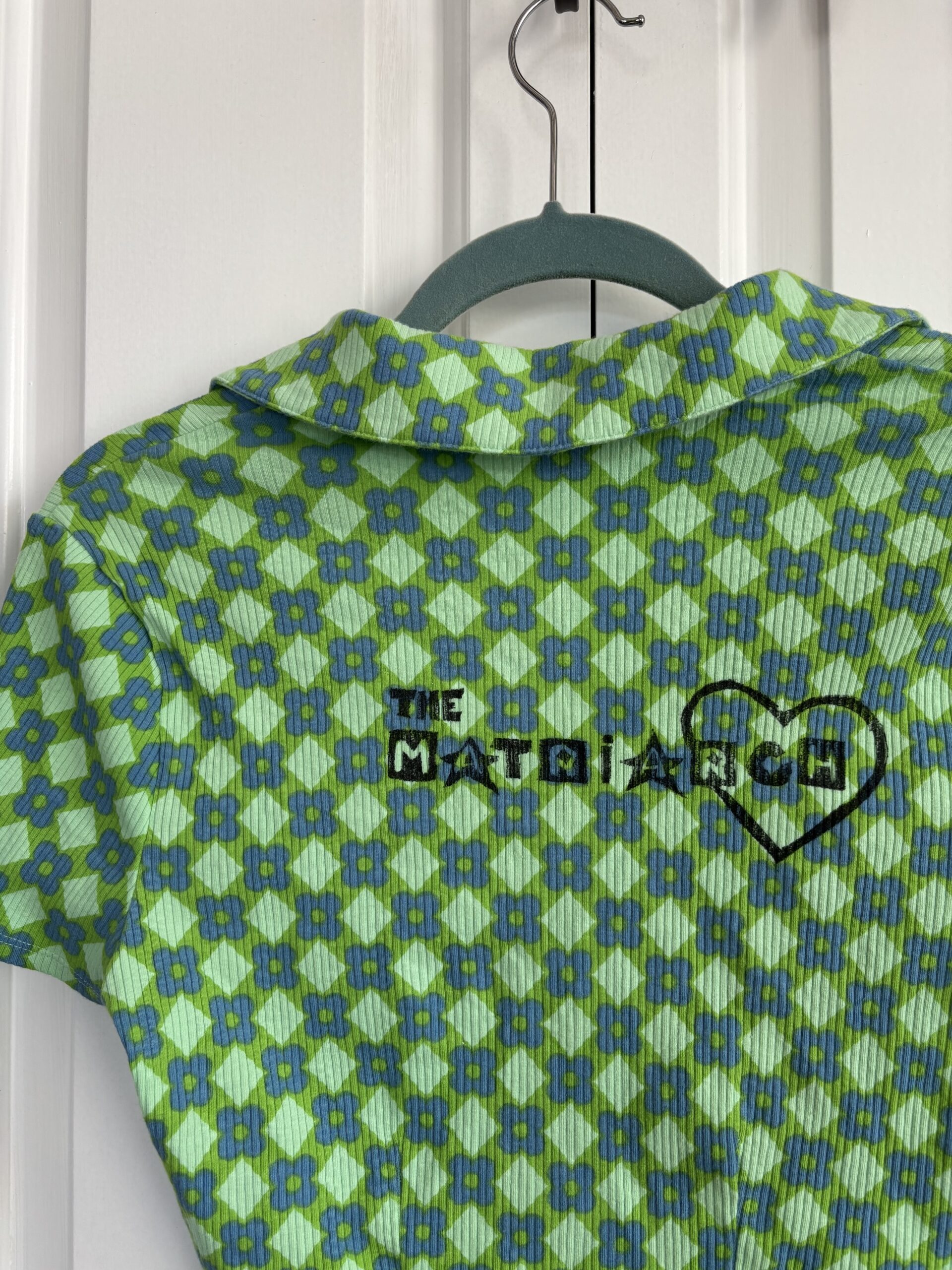 ‘The Matriarch’ green/blue patterned short sleeve button up with stars on the front. Thrifted, Wild Fable, size M. Printed by Mal Benoit.